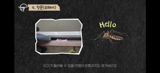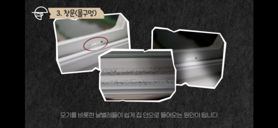 모기는 2mm의 작은 구멍으로도 들어올 수 있기 때문에 멀쩡하다고 생각했던 우리 집 창문엔 모기가 오갈 수 있는 통로가 생각보다 많습니다. 우선 창문 밑을 보면 창틀에 물이 차면 빠져나갈 수 있게 뚫린 물구멍이 있습니다. 바로 이 물구멍이 생각보다 커서 모기들에게 좋은 침투용 통로가 됩니다. 특히 날이 어두워지면 물구멍으로 새어나가는 집안 내부의 밝은 빛 때문에 모기를 비롯한 날벌레들이 쉽게 집 안으로 들어오는 원인이 됩니다. 물구멍은 테이프나 스펀지로 막아버려도 되지만 그럼 물이 빠져나가는 재기능을 하지 못하게 되기 때문에 물구멍 전용 방충망을 구입해 막아두면 물구멍의 기능은 살리고 모기의 유입은 막을 수 있습니다.4. 창문(모헤어)